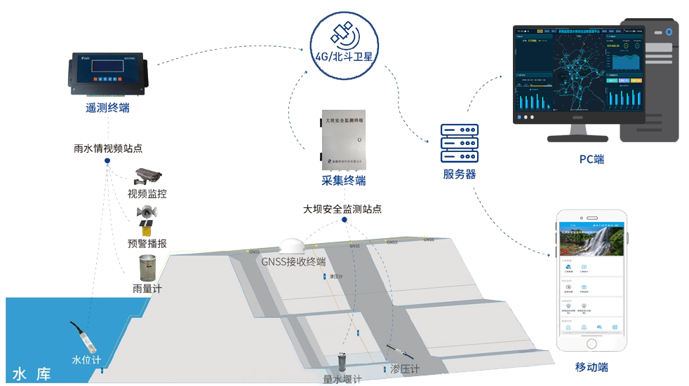 大坝安全监测系统由水库智能感知、物联网技术信息网络通信(RTU)、云端智慧监控管理工作平台组成。水库在线监测具有自动采集、分析和报告水库水位、降雨、图像、渗流等运行数据的功能,自组织网络和数据终端具有采集和通信各要素的功能,大坝安全监测预警系统的云平台具有监测数据的智能分析和预警功能,实现了水库运行状态的感知和监测、运行情况分析、安全管理、巡检在线管理等综合运行支撑,有效辅助相关部门制定防汛抗旱调度方案和应急预案,实现大坝安全的信息化管理。
